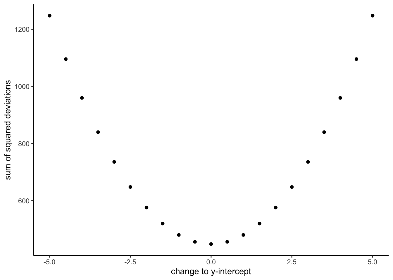 Figure Figure 3.5.8 shows how the sum of squared deviations (the sum of the squared lengths of the red lines) behaves as we move the line up and down. What’s going on here is that we are computing a measure of the total error as the black line moves through the best fit line. This represents the sum of the squared deviations. In other words, we square the length of each red line from the above animation, then we add up all of the squared red lines, and get the total error (the total sum of the squared deviations). The graph below shows what the total error looks like as the black line approaches then moves away from the best fit line. Notice, the dots in this graph start high on the left side, then they swoop down to a minimum at the bottom middle of the graph. When they reach their minimum point, we have found a line that minimizes the total error. This is the best fit regression line.