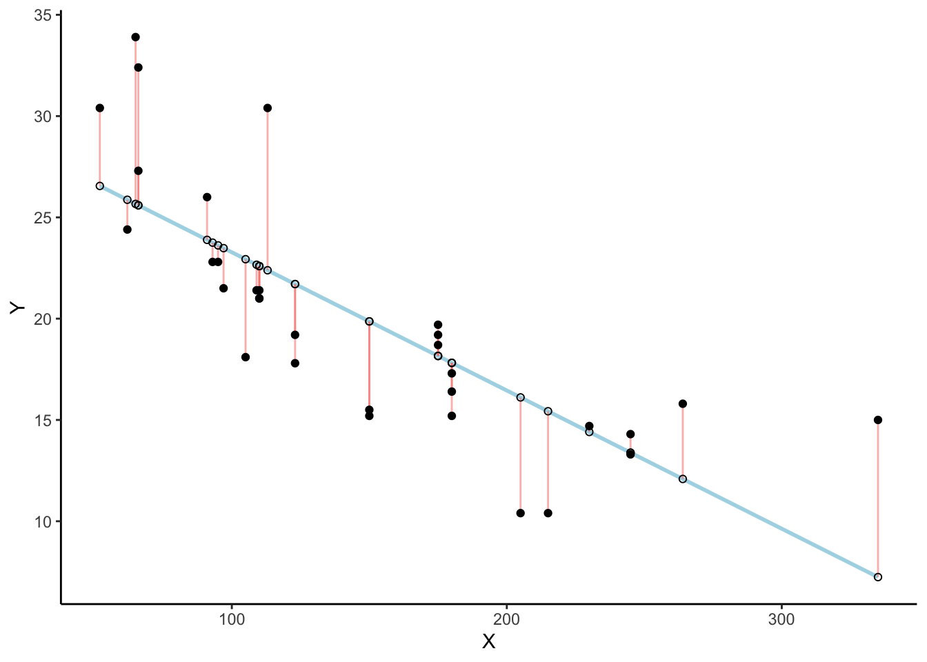 There’s a lot going on in Figure Figure 3.5.4. First, we are looking at a scatter plot of two variables, an X and Y variable. Each of the black dots are the actual values from these variables. You can see there is a negative correlation here, as X increases, Y tends to decrease. We drew a regression line through the data, that’s the blue line. There’s these little white dots too. This is where the line thinks the black dots should be. The red lines are the important residuals we’ve been talking about. Each black dot has a red line that drops straight down, or straight up from the location of the black dot, and lands directly on the line. We can already see that many of the dots are not on the line, so we already know the line is "off" by some amount for each dot. The red line just makes it easier to see exactly how off the line is.