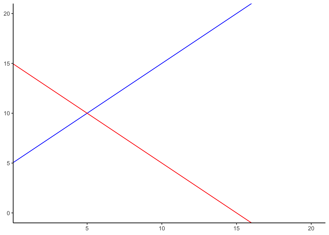 The formula for the blue line is \(y = 1*x + 5\text{.}\) Let’s talk about that. When x = 0, where is the blue line on the y-axis? It’s at five. That happens because 1 times 0 is 0, and then we just have the five left over. How about when x = 5? In that case y =10. You just need the plug in the numbers to the formula, like this: