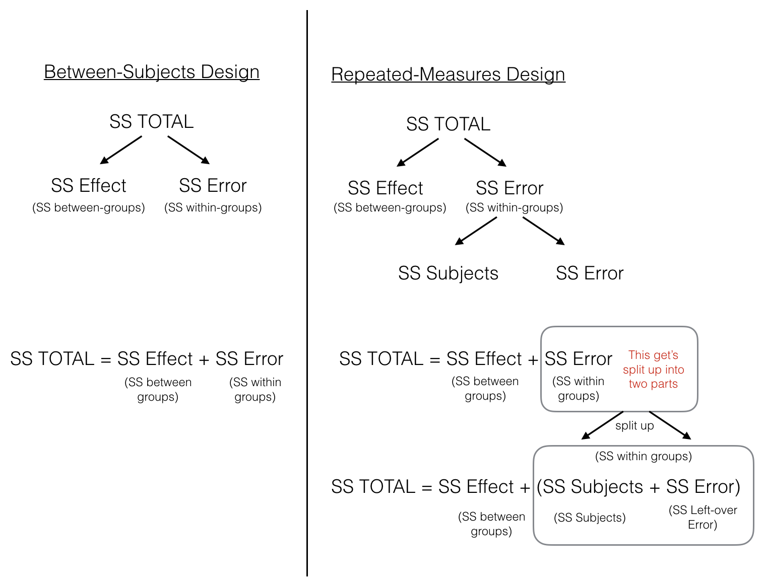 The figure lines up the partitioning of the Sums of Squares for both between-subjects and repeated-measures designs. In both designs, \(SS_\text{Total}\) is first split up into two pieces \(SS_\text{Effect (between-groups)}\) and \(SS_\text{Error (within-groups)}\text{.}\) At this point, both ANOVAs are the same. In the repeated measures case we split the \(SS_\text{Error (within-groups)}\) into two more littler parts, which we call \(SS_\text{Subjects (error variation about the subject mean)}\) and \(SS_\text{Error (left-over variation we can't explain)}\text{.}\)