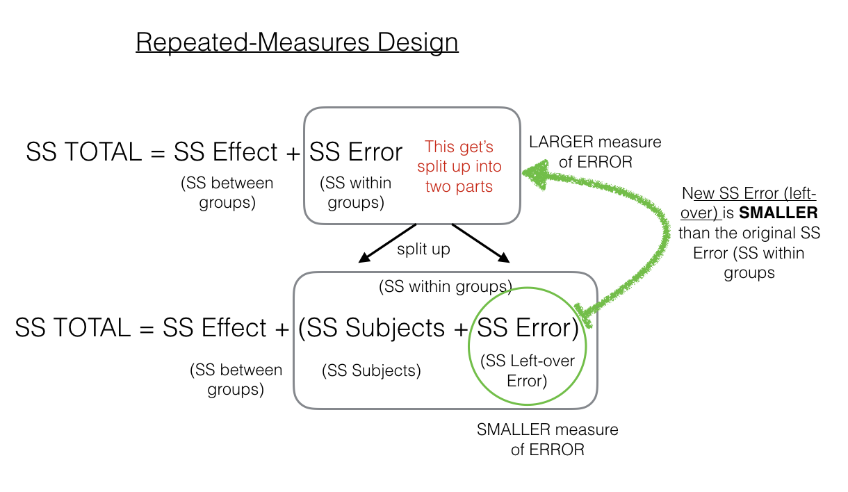 As we point out, the \(SS_\text{Error (left-over)}\) in the green circle will be a smaller number than the \(SS_\text{Error (within-group)}\text{.}\) That’s because we are able to subtract out the \(SS_\text{Subjects}\) part of the \(SS_\text{Error (within-group)}\text{.}\) As we will see shortly, this can have the effect of producing larger F-values when using a repeated-measures design compared to a between-subjects design.