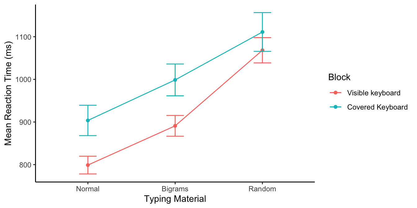 OK, I made a figure showing the mean reaction times for the different typing material conditions. You will notice that there are two sets of lines. That’s because there was another manipulation I didn’t tell you about. In one block of trials participants got to look at the keyboard while they typed, but in the other condition we covered up the keyboard so people had to type without looking. Finally, the error bars are standard error of the means.