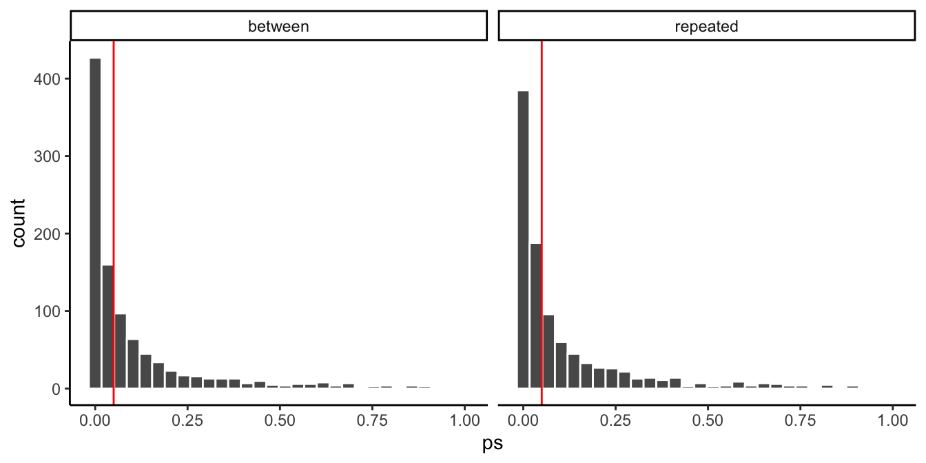 For the within subject design, there were roughly 550 experiments with a \(p\) less than 0.05, or approximately 0.55 of experiments were “significant”, with alpha=.05.