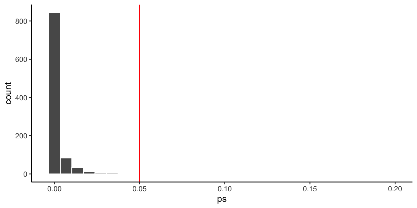 Here we have two distributions of observed p-values for the simulations. The red line shows the location of 0.05. Overall, we can see that for both designs, we got a full range of \(p\)-values from 0 to 1. This means that many times we would not have rejected the hypothesis of no differences (even though we know there is a small difference). We would have rejected the null every time the \(p\)-value was less than 0.05.