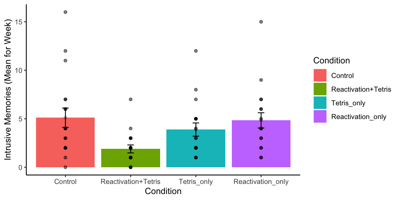 OOooh, look at that. We did something fancy. Figure 7.4.2 shows the data from the four groups. The height of each bar shows the mean intrusive memories for the week. The dots show the individual scores for each subject in each group (useful to to the spread of the data). The error bars show the standard errors of the mean.