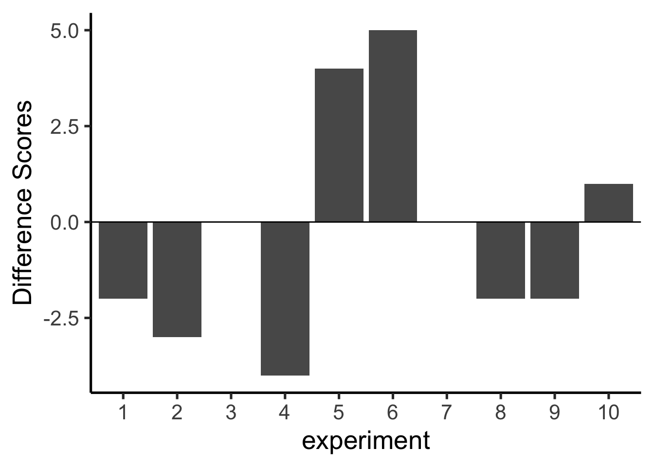 Let’s think about our measure of green balls in terms of a difference. For example, in each experiment we counted the green balls for the left and right hand. What we really want to know is if there is a difference between them. So, we can calculate the difference score. Let’s decide that the difference score = # of green gumballs in left hand - # of green gumballs in right hand. Figure 5.4.2 redraws the 10 bar graphs from above; however, now there is only one bar for each experiment. This bar represents the difference in number of green gumballs drawn by the left and right hand.