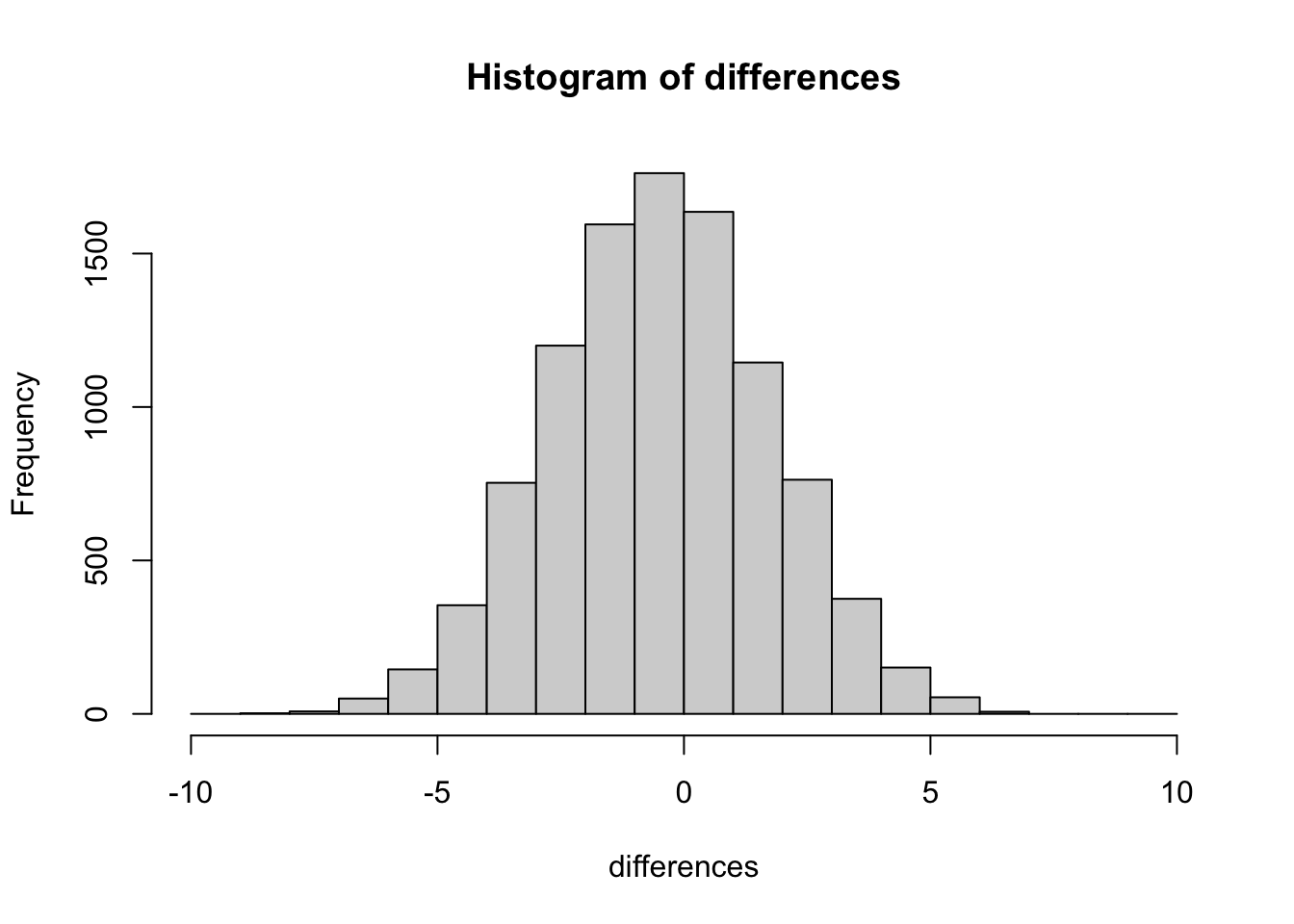 Now that we have a method for simulating differences due to chance, let’s run 10,000 simulated experiments. But, instead of plotting the differences in a bar graph for each experiment, how about we look at the histogram of difference scores. The histogram in Figure 5.4.6 provides a clearer picture about which differences happen most often, and which ones do not. This will be another window into observing what kinds of differences chance is capable of producing.