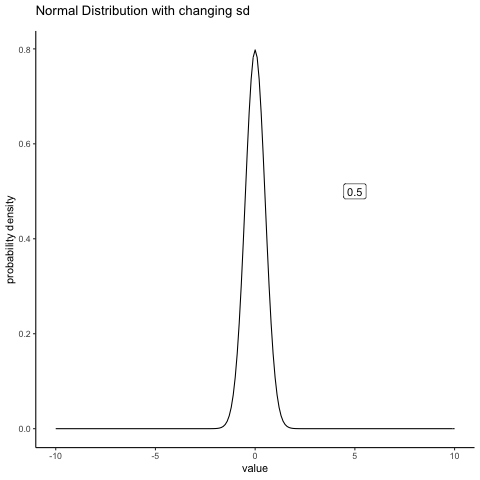 Figure 13.4.2. Normal distribution with changing standard deviationsome_sds<-seq(0.5,5,.5)
