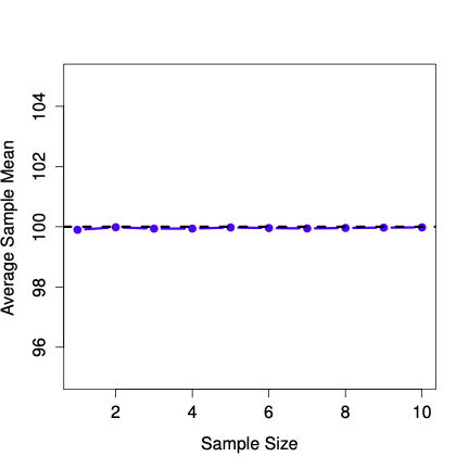 Figure 4.13.5 shows the sample mean as a function of sample size. Notice it’s a flat line. The sample mean doesn’t underestimate or overestimate the population mean. It is an unbiased estimate!