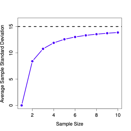 Figure 4.13.7 shows the sample standard deviation as a function of sample size. Notice it is not a flat line. The sample standard deviation systematically underestimates the population standard deviation!