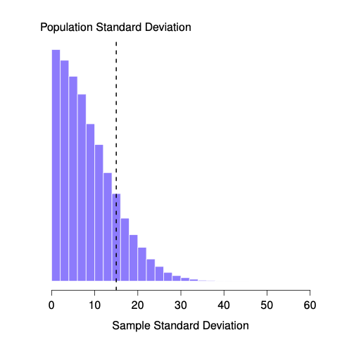 Even though the true population standard deviation is 15, the average of the sample standard deviations is only 8.5. Notice that this is a very different from when we were plotting sampling distributions of the sample mean, those were always centered around the mean of the population.