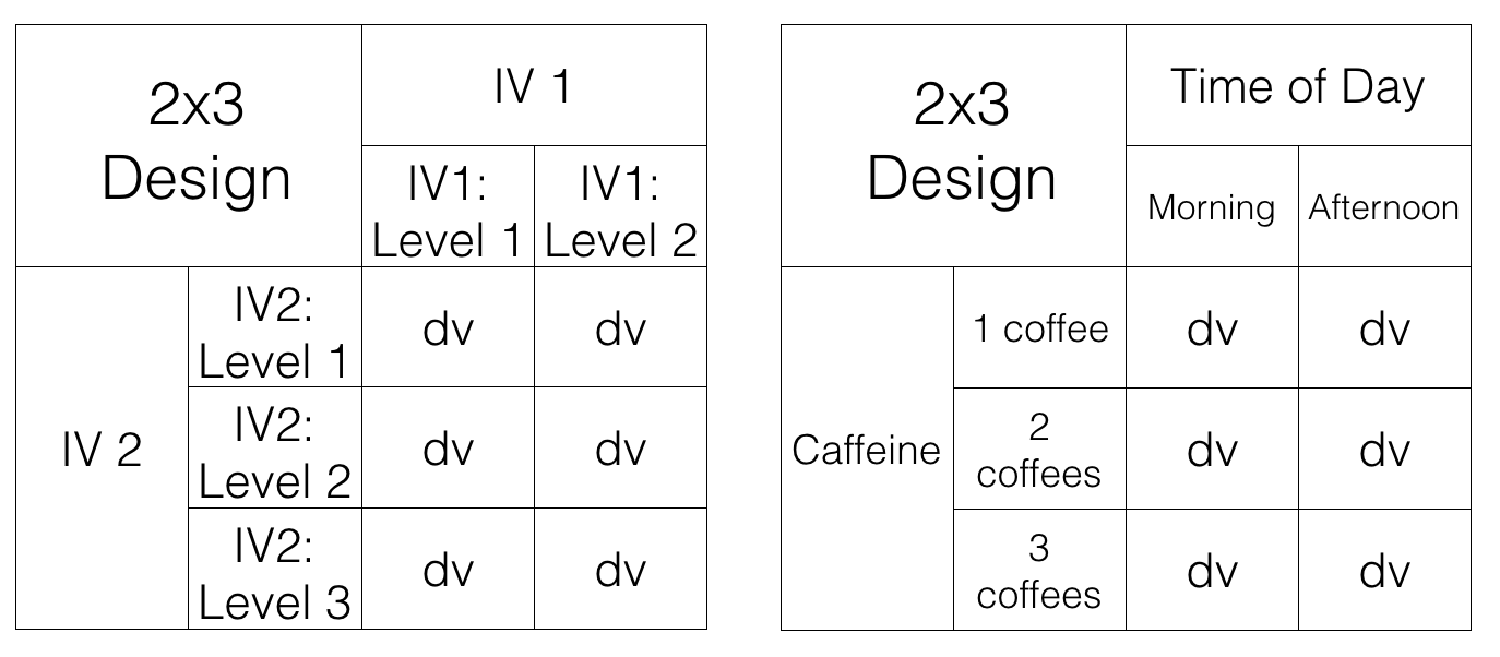 We could say the same thing, but talk from the point of view of the second IV. For example, when people drink caffeine, we test those people in the morning, and in the afternoon. So, time of day is manipulated for the people who drank caffeine. Also, when people do not drink caffeine, we test those people in the morning, and in the afternoon, So, time of day is manipulated for the people who did not drink caffeine.