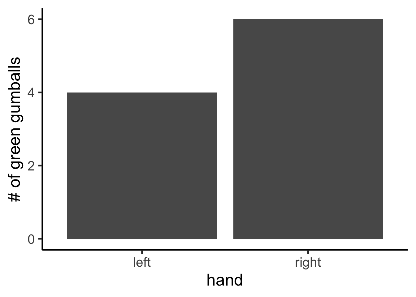 These 10 experiments give us a better look at what chance can do. It should also mesh well with your expectations. If everything is determined by chance (as we have made it so), then sometimes your left hand will choose more green balls, sometimes your right hand will choose more green gumballs, and sometimes they will choose the same amount of gumballs. Right? Right.