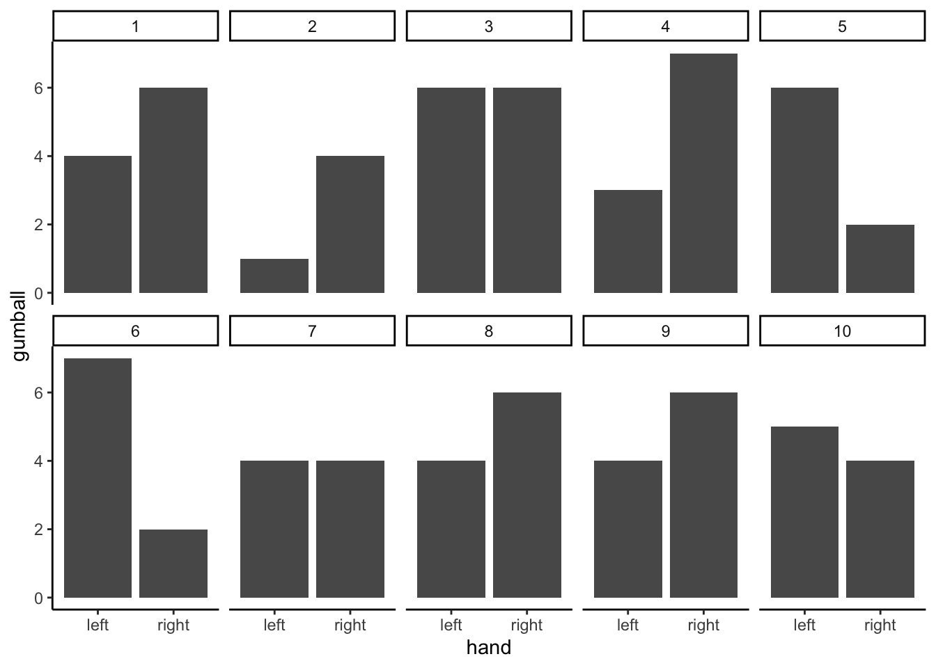 The first thing to do is pretend you conduct the gumball experiment 10 times in a row. This will produce 10 different sets of results. Figure 5.3.6 shows bar graphs for each replication of the experiment. Now we can look at whether the left hand chose more green gumballs than red gumballs.