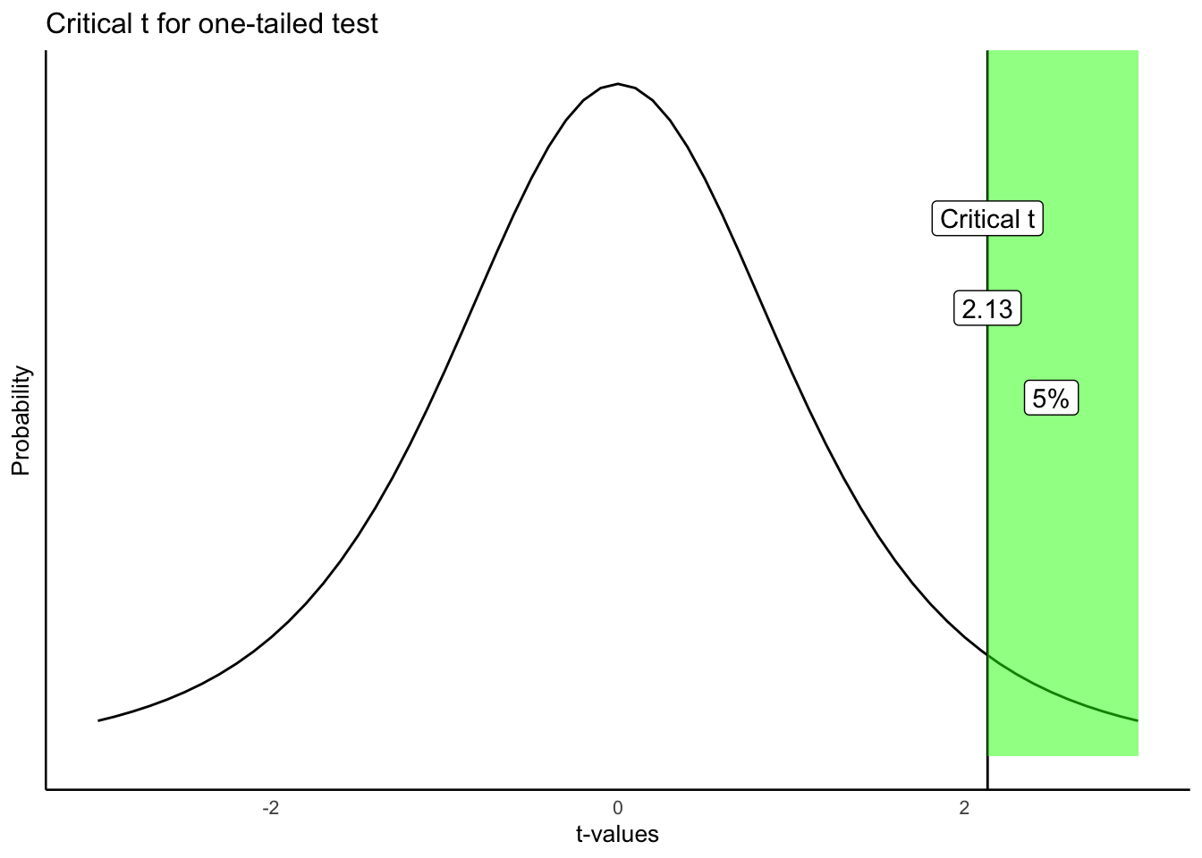 Critical \(t\text{.}\) The critical \(t\) is the \(t\)-value associated with the alpha-criterion. In this case for a one-tailed test, it is the \(t\) value where 5% of all \(t\)s are this number or greater. In our example, the critical \(t\) is 2.13. 5% of all \(t\) values (with degrees of freedom = 4) are +2.13, or greater than +2.13.
