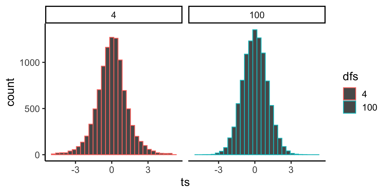 If we wanted to simulate the \(t\) distribution we could more easily see what influence degrees of freedom has on the shape of the distribution. Remember, \(t\) is a sample statistic, it is something we measure from the sample. So, we could simulate the process of measuring \(t\) from many different samples, then plot the histogram of \(t\) to show us the simulated \(t\) distribution.