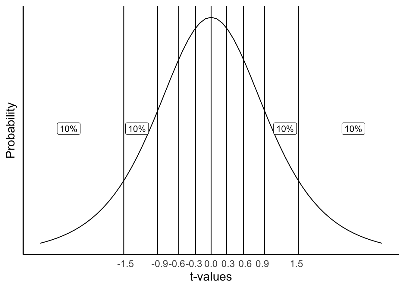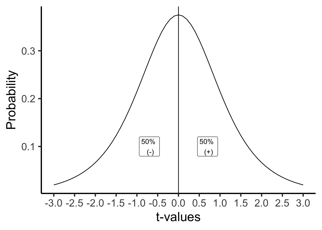 The figure shows that \(t\) values of +2.13 or greater occur 5% of the time. Because the t-distribution is symmetrical, we also know that \(t\) values of -2.13 or smaller also occur 5% of the time. Both of these properties are true under the null distribution of no differences. This means, that when there really are no differences, a researcher can expect to find \(t\) values of 2.13 or larger 5% of the time.