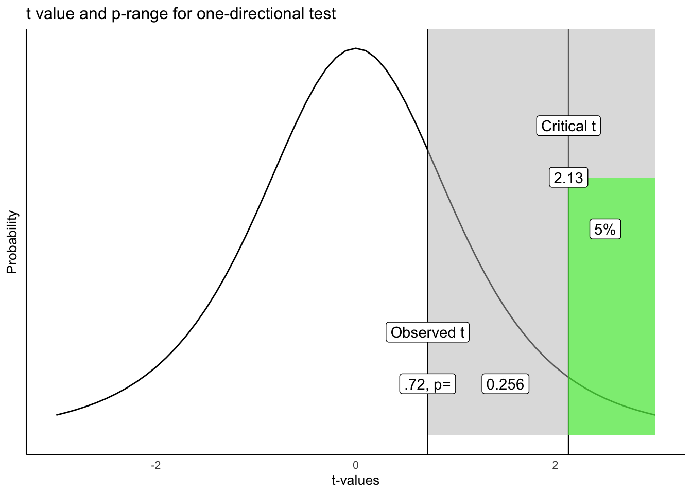 Following the “standard” decision making procedure, we would claim that our \(t\) value was not statistically significant, because it was not large enough. If our observed value was larger than the critical \(t\) (larger than 2.13), defined by our alpha criterion, then we would claim that our \(t\) value was statistically significant. This would be equivalent to saying that we believe it is unlikely that the difference we observed was due to chance. In general, for any observed \(t\) value, the associated \(p\)-value tells you how likely a \(t\) of the observed size or larger would be observed. The \(p\)-value always refers to a range of \(t\)-values, never to a single \(t\)-value. Researchers use the alpha criterion of 0.05, as a matter of convenience and convention. There are other ways to interpret these values that do not rely on a strict (significant versus not) dichotomy.