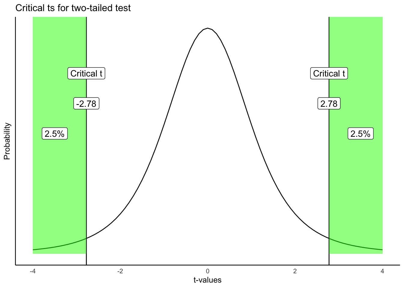 As a result, the critical \(t\) value is (+/-) 2.78 for a two-tailed test. As you can see, the two-tailed test is blind to the direction or sign of the difference. Because of this, the critical \(t\) value is also higher for a two-tailed test, than for the one-tailed test that we did earlier. Hopefully, now you can see why it is called a two-tailed test. There are two tails of the distribution, one on the left and right, both shaded in green.