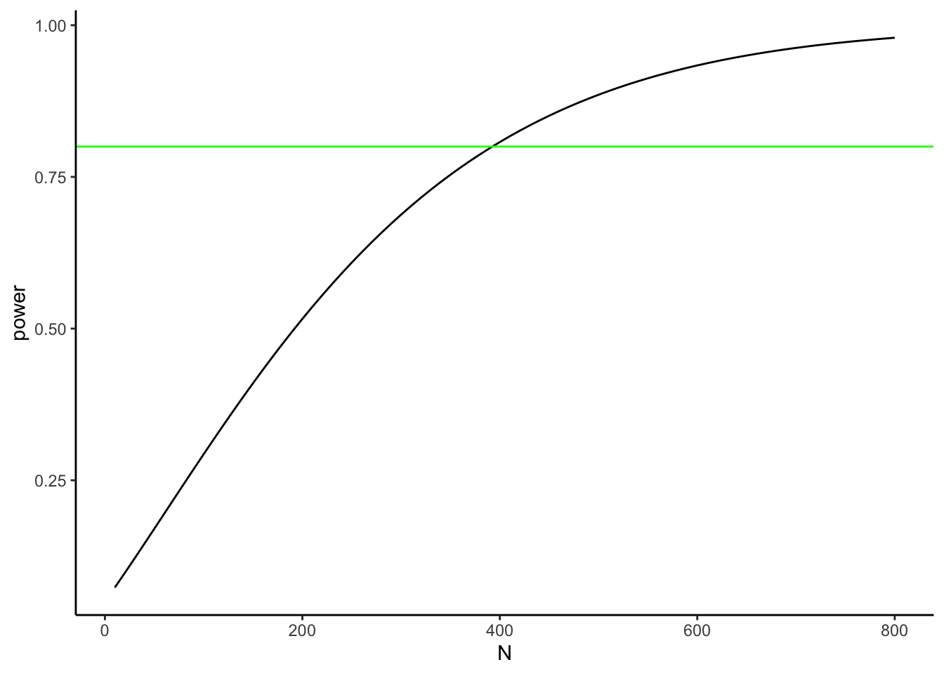 The figure plots power to detect an effect of d=0.2, as a function of N. The green line shows where power = .8, or 80%. It looks like we would nee about 380 subjects in each group to measure an effect of d=0.2, with power = .8. This means that 80% of our experiments would succesfully show p less than 0.05. Often times power of 80% is recommended as a reasonable level of power, however even when your design has power = 80%, your experiment will still fail to find an effect (associated with that level of power) 20% of the time!