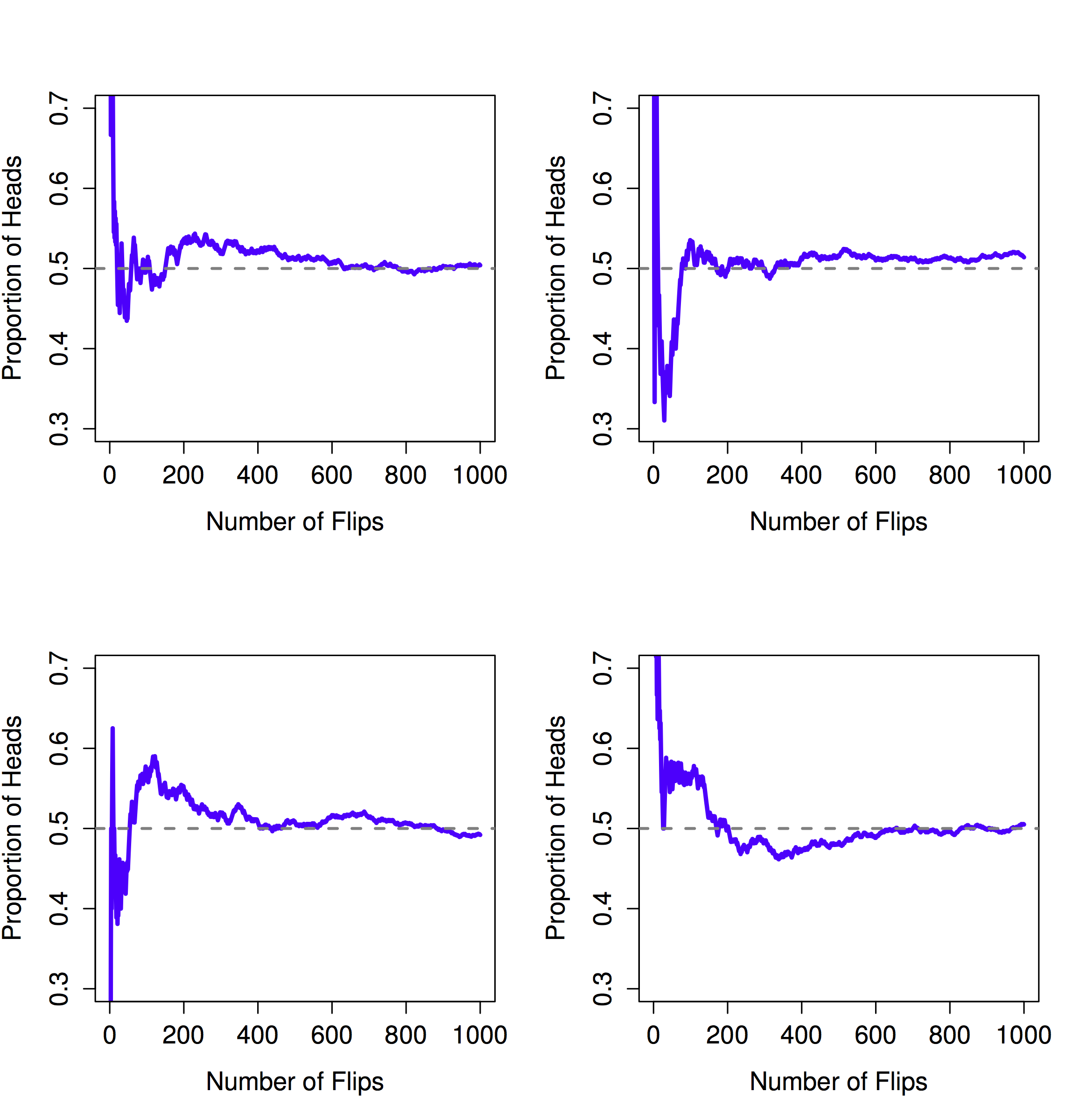 Notice that at the start of the sequence, the proportion of heads fluctuates wildly, starting at .00 and rising as high as .80. Later on, one gets the impression that it dampens out a bit, with more and more of the values actually being pretty close to the "right" answer of .50. This is the frequentist definition of probability in a nutshell: flip a fair coin over and over again, and as \(N\) grows large (approaches infinity, denoted \(N\rightarrow \infty\)), the proportion of heads will converge to 50%. There are some subtle technicalities that the mathematicians care about, but qualitatively speaking, that’s how the frequentists define probability. Unfortunately, I don’t have an infinite number of coins, or the infinite patience required to flip a coin an infinite number of times. However, I do have a computer, and computers excel at mindless repetitive tasks. So I asked my computer to simulate flipping a coin 1000 times, and then drew a picture of what happens to the proportion \(N_H / N\) as \(N\) increases. Actually, I did it four times, just to make sure it wasn’t a fluke. The results are shown in Figure 4.2.4. As you can see, the proportion of observed heads eventually stops fluctuating, and settles down; when it does, the number at which it finally settles is the true probability of heads.