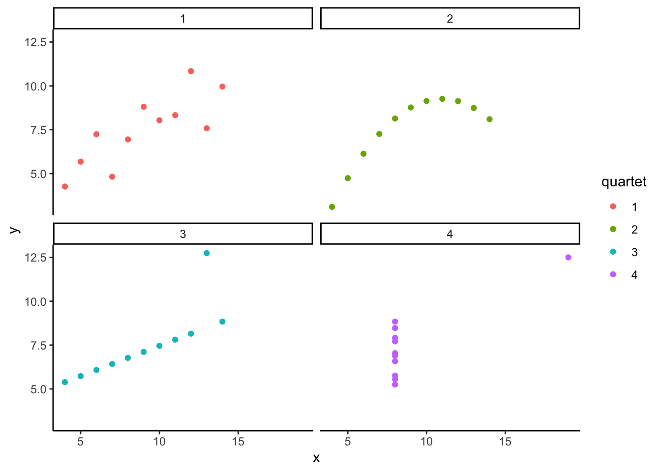 To hit this point home, and to get you thinking about the issues we discuss in the next chapter, check this out. It’s called Anscombe’s Quartet, because these interesting graphs and numbers and numbers were produced by [Anscombe (1973)]. In Figure 2.8.2 you are looking at pairs of measurements. Each graph has an X and Y axis, and each point represents two measurements. Each of the graphs looks very different, right?