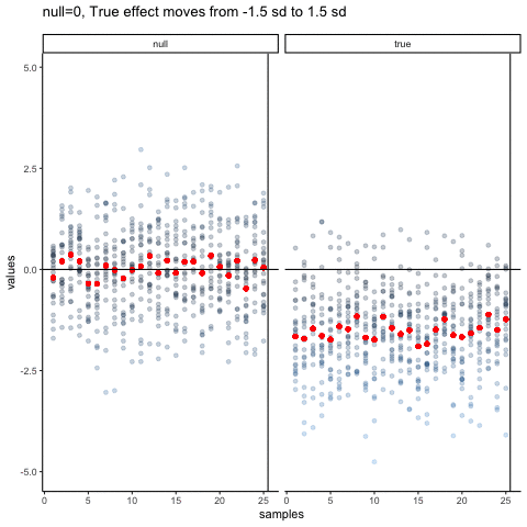 The null dots show 50 different samples, with the red dot as the mean for each sample. Null dots are all sampled from normal (u=0, sd=1). The true dots show 50 more samples, with red dots for their means. However, the mean of the true shifts between -1.5 and +1.5 standard deviations of 0. This illustrates how a true effect moves in and out of the null range.