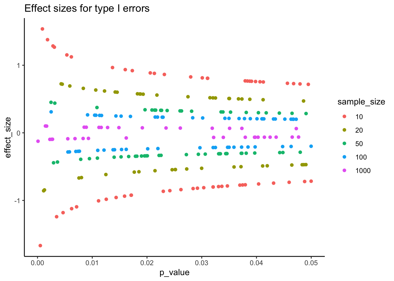 For example, look at the red dots, when sample size is 10. Here we see that the effect-sizes are quite large. When p is near 0.05 the effect-size is around .8, and it goes up and up as when p gets smaller and smaller. What does this mean? It means that when you get unlucky with a small N design, and your manipulation does not work, but you by chance find a “significant” effect, the effect-size measurement will show you a “big effect”. This is the pernicious aspect. When you make a type I error for small N, your data will make you think there is no way it could be a type I error because the effect is just so big!. Notice that when N is very large, like 1000, the measure of effect-size approaches 0 (which is the true effect-size in the simulation shown in Figure 12.4.4).