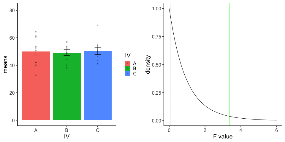 Three groups, N=10, all observations sampled from same normal distribution (mu=50, sd = 10)