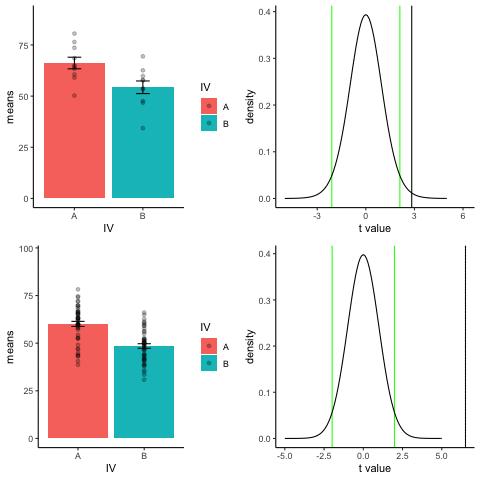 The observed t-value occurs past the critical value (green) line much more reliably and often when sample size is larger than smaller.