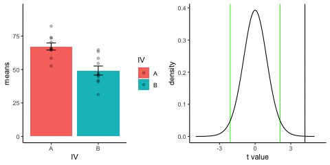 The right panel shows a t-distribution (df=18) along with the observed t-statistic for each simulation.