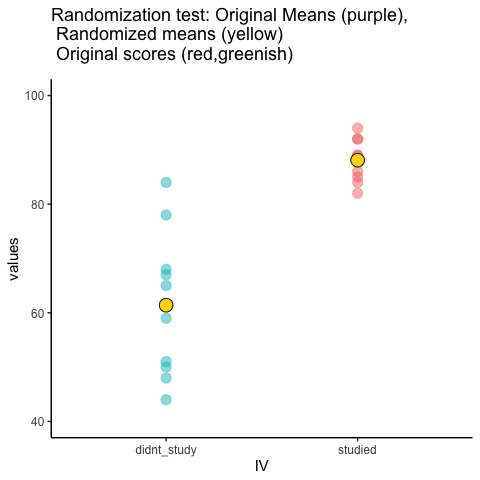 This is an attempt at visualizing a randomization test. Samples are taken under two conditions of the IV (A and B). At the beginning of the animation, the original scores in the first condition are shown as green dots on the left, and the original scores in the second condition are the red dots on the right. The means for each group are the purple dots. During the randomization, the original scores are shuffled randomly between the two conditions. After each shuffle, two new means are computed and displayed as the yellow dots. This occurs either for all permutations, or for a large random sample of them. The animation shows the original scores being shuffled around across the randomizations (the colored dots switch their original condition, appearing from side to side).