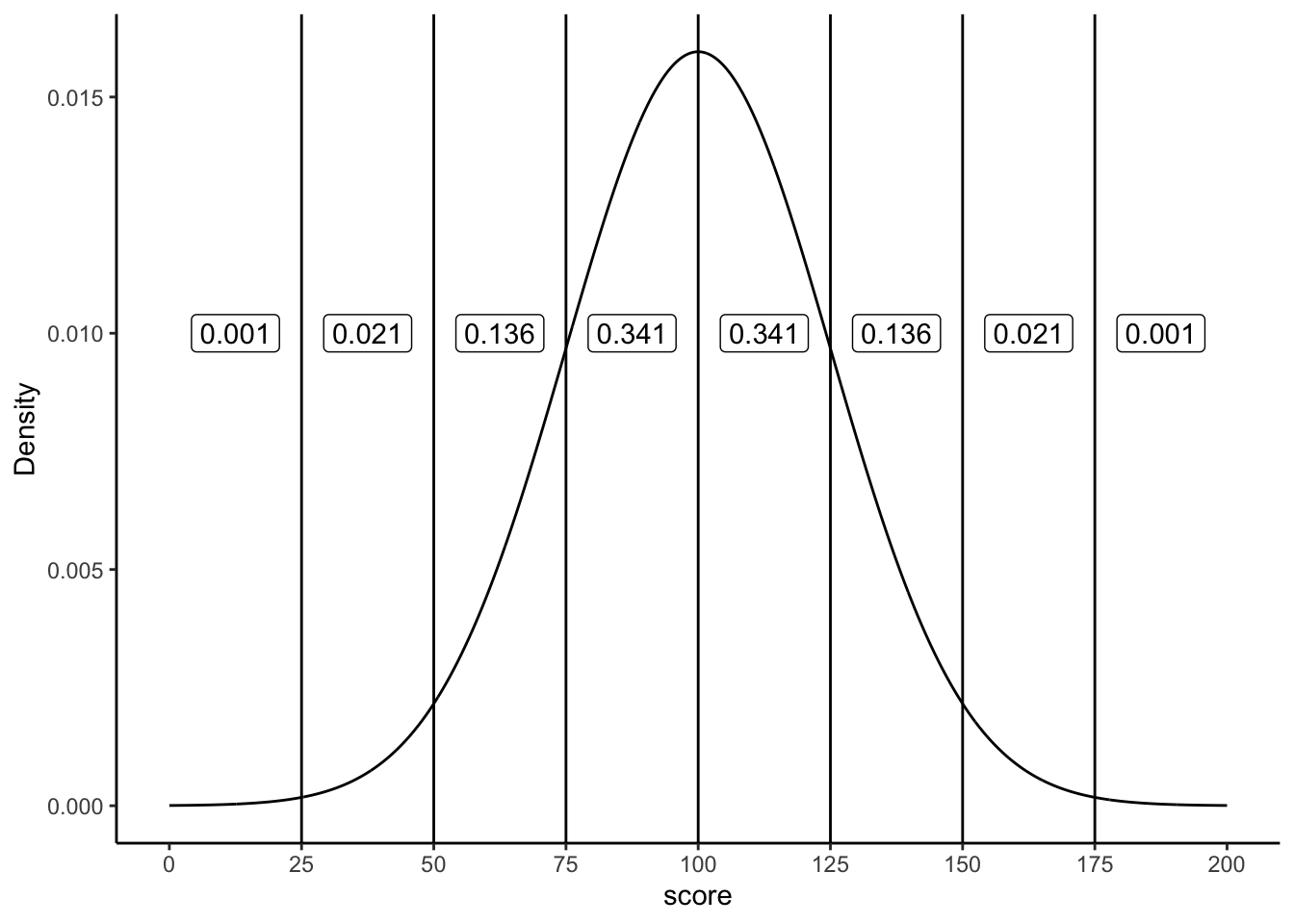 Now we are looking at a normal distribution with mean = 100 and standard deviation = 25. Notice that the region between 100 and 125 contains 34.1% of the scores. This region is 1 standard deviation away from the mean (the standard deviation is 25, the mean is 100, so 25 is one whole standard deviation away from 100). As you can see, the very same proportions occur between each of the standard deviations, as they did when our standard deviation was set to 1 (with a mean of 0).